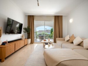 This apartment is a modern two-bedroom, two-bathroom home set in a private gated community in La Quinta. Surrounded by a renowned golf course and mountain views, the property offers peace and privacy while being only a short drive to Marbella. The apartment has bright living spaces and private terraces that look across the lake and the Sierra de las Nieves.