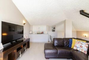 With a built area of approximately 112 m² on a private plot of around 236 m², this light-filled home welcomes you with a spacious living room featuring a cozy fireplace and large windows that open onto a sunny south-facing terrace — the perfect spot to relax, entertain guests, or enjoy outdoor dining with uninterrupted sea views.