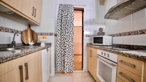 The property features a separate kitchen, a living room, and a bedroom with built-in wardrobes offering ample storage. From the living room, you have access to one of the apartment’s two terraces, with space for a dining table and chairs — ideal for outdoor meals or relaxing.