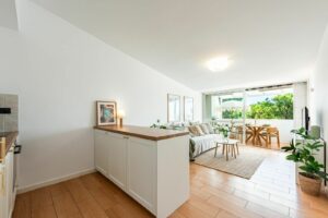 The apartment is situated half a flight up and laid out on one level, featuring a spacious bedroom with built-in wardrobes, a bathroom, and a hallway leading to a stylish open-plan kitchen and living area. From the living room you step out onto the sunny south-facing terrace with beautiful sea views – the perfect spot for relaxation, dining and soaking up the sun all year round. For those who wish, access to a lovely communal pool area is also available for a small fee, ideal during the warm summer months.