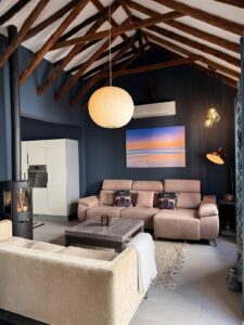 The apartment features an open living concept with dramatic double-height ceilings, original wood beams, and a cozy wood-burning stove. Every detail has been carefully considered in the stunning furnishings and decoration.