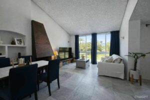 This bright and spacious one-bedroom apartment welcomes you into an open-plan living area filled with natural light. Large windows frame lovely views over the communal pool and lush landscaped gardens, creating a relaxing atmosphere.