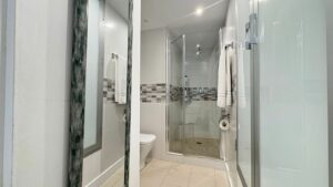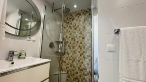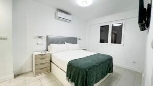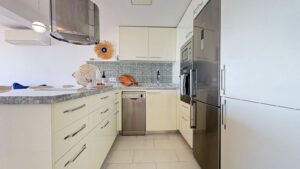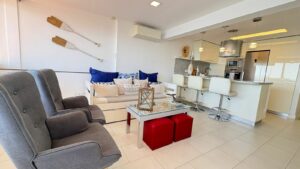 With panoramic sea views from the living room, this beautifully renovated apartment features a master suite bedroom, an additional full bathroom, and an inviting living area with sofa beds. The open American kitchen blends seamlessly into the space, ideal for relaxed mornings or entertaining friends.