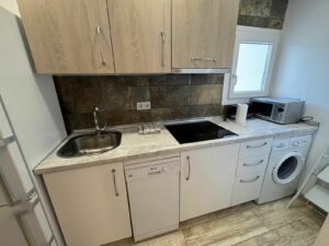 The bedroom has built-in wardrobes and large windows, while the bathroom, renovated with high-quality materials, offers functionality and elegance.