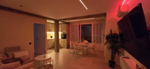 The fully equipped kitchen includes LED ambient lighting and top-tier German-made Bosch appliances, including a dishwasher and washing machine, all selected for performance and reliability.