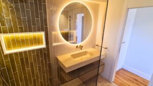 It includes air conditioning, electric blinds, mosquito nets, a smart TV in both the living room and bedroom, and a covered porch with a pergola leading to a landscaped patio. It also has a ground-floor storage room with a washer-dryer, solar panels (minimal electricity cost), and independent access, ideal for a vacation rental.