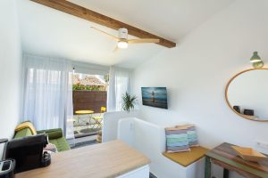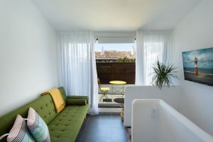 Upstairs we have a kitchenette with breakfast corner and views over the main pool and the sea.