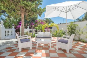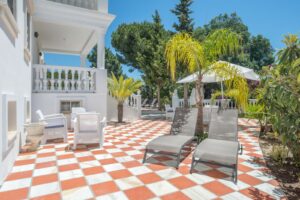The villa has a spacious living room covered by a glass ceiling, with roman columns, carpets and drapes, and has multiple seating areas. From here there is a direct access to the back terrace with patio and BBQ area, with an outdoor equipped kitchen, interior with large formal dining room and a fully fitted kitchen.