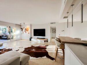 Magnificent 2-bedroom, 2+1-bathroom apartment located in the prestigious Marqués de Atalaya development, set on the front line of the golf course and recently subjected to a full high-end renovation. As a corner apartment, it benefits from all exterior windows, offering exceptional natural light throughout the day and an outstanding level of privacy.