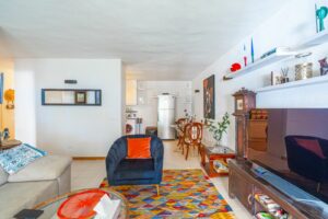 The property offers 2 bedrooms and 2 bathrooms, a comfortable living-dining area, a fully equipped kitchen, and a private terrace with pleasant views over the gardens and swimming pool, as well as partial sea views. Its functional layout and high-quality finishes ensure comfort and practicality throughout the year.
