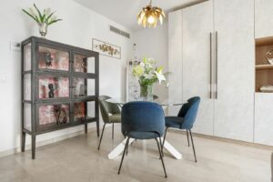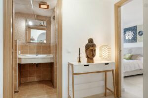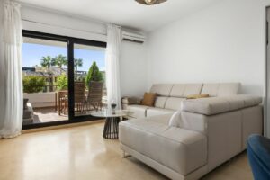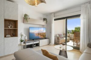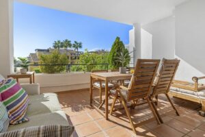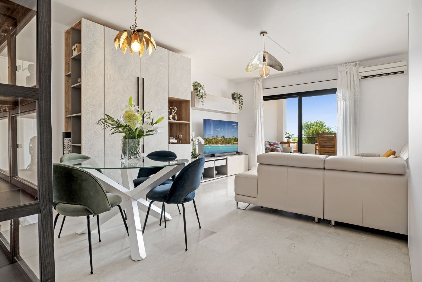 The apartment itself features a spacious living room that opens directly onto a west-facing terrace with open views, ideal for enjoying sunsets and outdoor dining. The master bedroom includes an en-suite bathroom, while the second bedroom and bathroom provide comfortable space for family or guests. The home also boasts a fully equipped kitchen with a utility room for extra practicality.