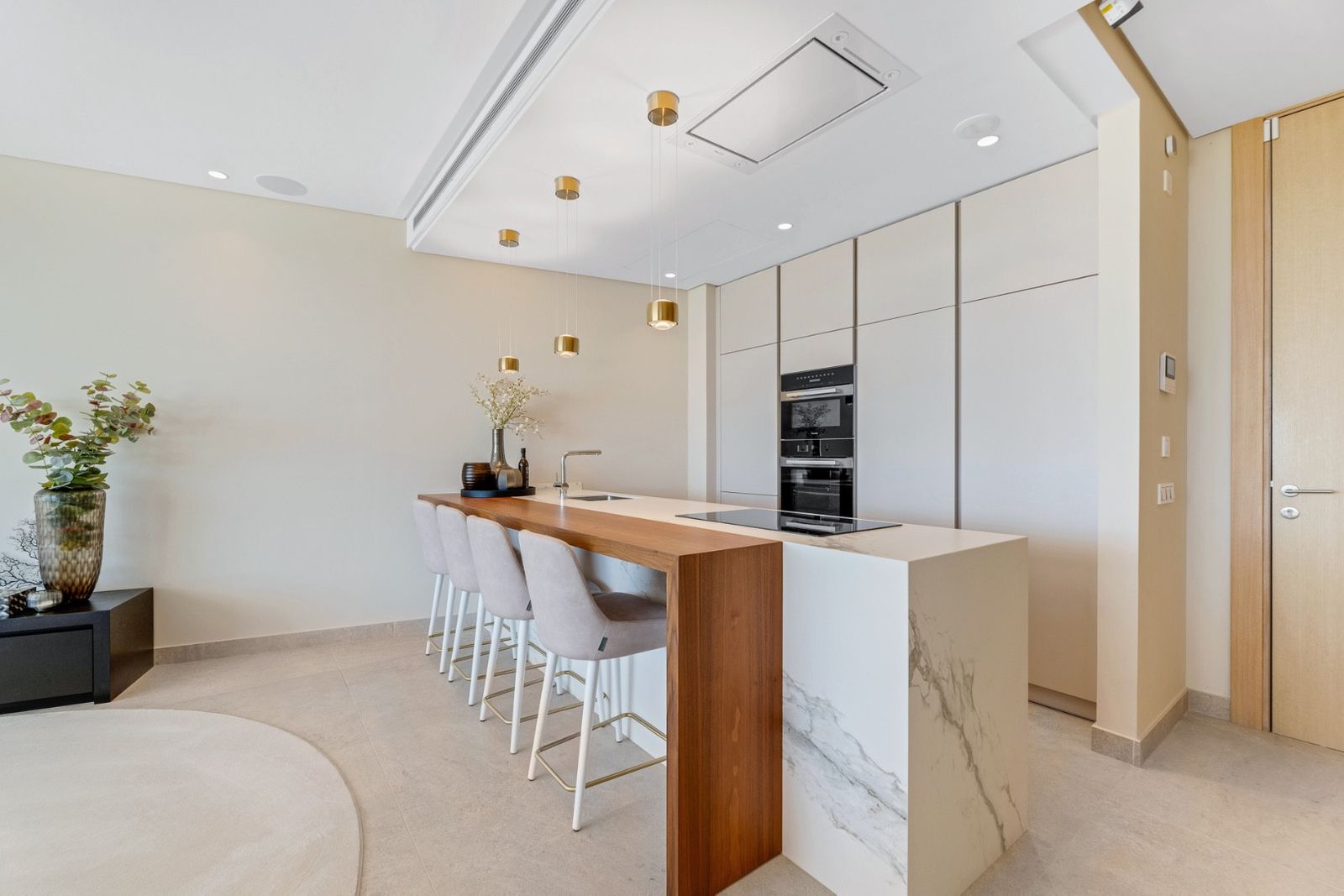 The apartment itself exudes refined elegance, featuring spacious interiors and an open-plan living and dining area with floor-to-ceiling windows that fill the space with natural light. Sliding glass doors connect seamlessly to expansive terraces and a private 126 m² garden — the perfect setting to enjoy panoramic sea views and spectacular Mediterranean sunsets. The contemporary kitchen is equipped with high-end appliances, while the two en-suite bedrooms offer comfort and privacy. A guest toilet adds further convenience. The property also includes two private parking spaces with pre-installation for electric vehicle charging and a storage room.