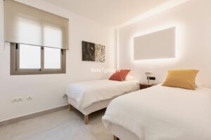 The master suite, which opens directly onto the terrace, includes a walk-in closet and a modern microcement bathroom. The second bedroom, ideal for guests or children, features built-in wardrobes and a bathroom also finished in microcement.