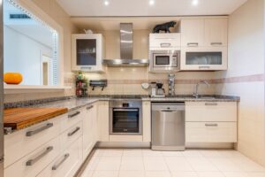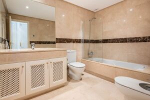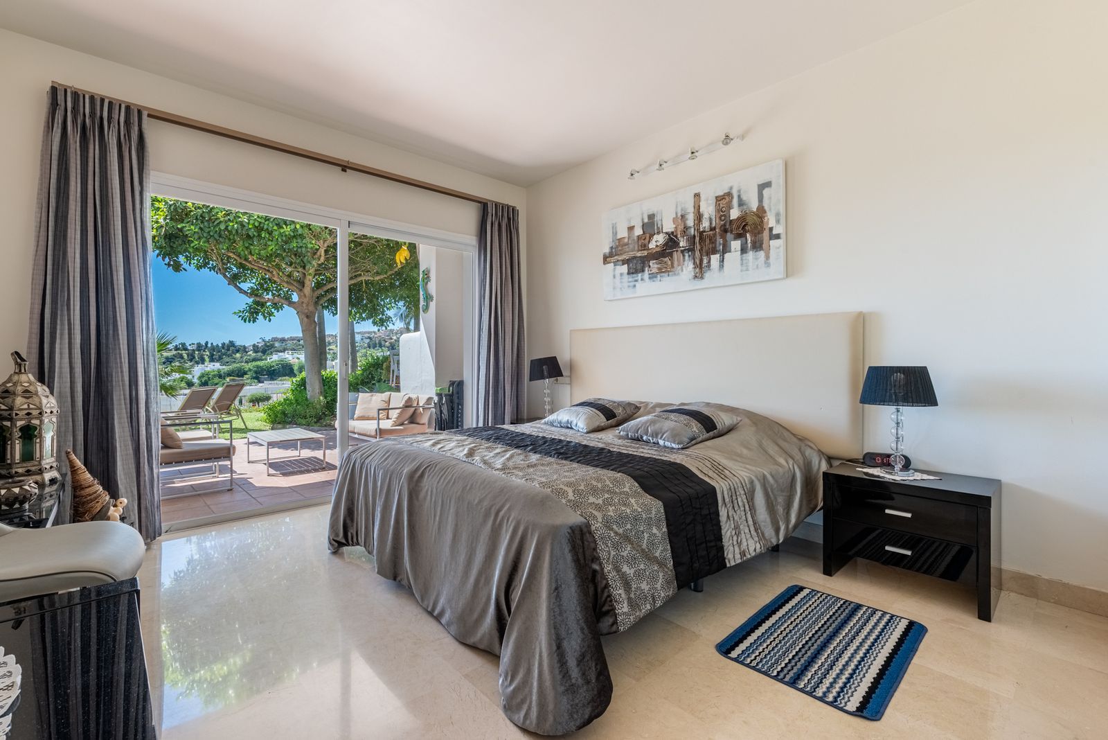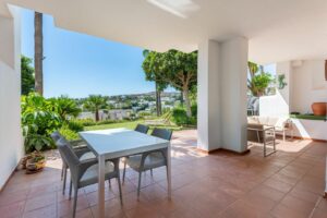 The property boasts a generous 42 m² terrace, partly covered for year-round use, and a private garden of around 50 m², creating an inviting space for outdoor dining, sunbathing, or simply relaxing while taking in the stunning views. Facing southwest, the terrace and garden enjoy long afternoon sun and sweeping vistas over the coast, stretching all the way to Gibraltar and the mountains of Africa.