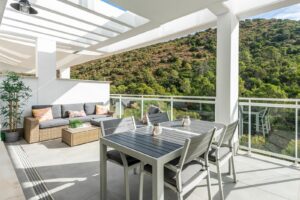 A private terrace extends the living space outdoors, providing an ideal spot for al fresco dining, relaxing, or simply enjoying the pleasant views of the natural surroundings that make Benahavís so special.