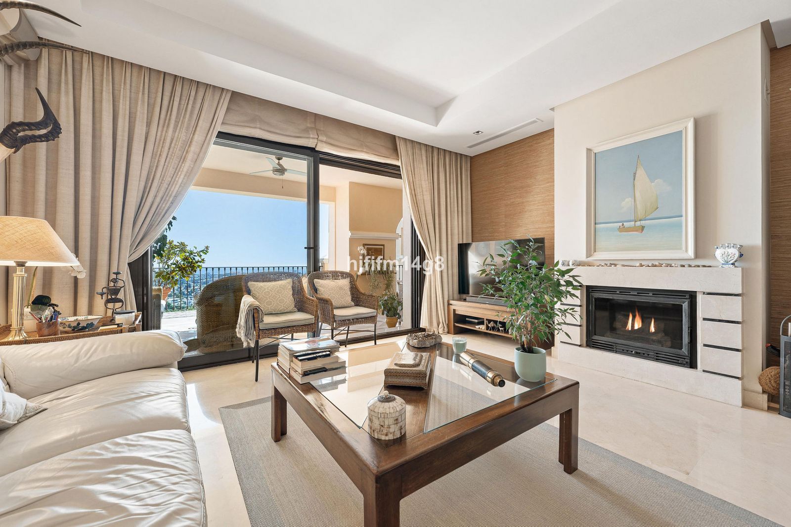The apartment itself is spacious, bright, and beautifully presented. The open-plan living and dining area includes a cozy fireplace and opens directly onto a covered terrace with panoramic views over the Mediterranean Sea, La Concha Mountain, the communal gardens, and the La Quinta Golf Course. The fully fitted kitchen includes a charming breakfast area and a separate utility room for added convenience. The property features two generous bedrooms and two modern bathrooms, both with walk-in showers and underfloor heating. The master bedroom enjoys direct access to the main terrace and an en-suite bathroom, while the second bedroom is equally comfortable and served by a separate bathroom.