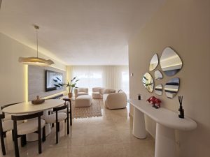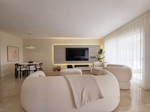 Bright and spacious 2-bedroom, 2-bathroom apartment set within the gated community of Altos de la Quinta, Benahavís, offering open views over the golf course, lake and the Mediterranean Sea.