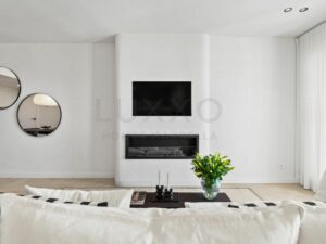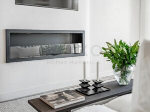 The apartment has been thoughtfully redesigned to maximise space and natural light, creating an exceptionally wide and spacious living area with a bright and open feel. The living room is stylishly finished and features a large TV screen and a cosy fireplace, making it the perfect place to relax and unwind.
