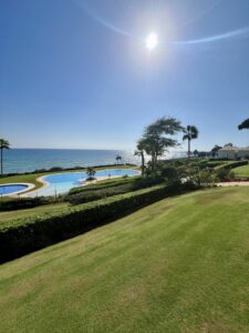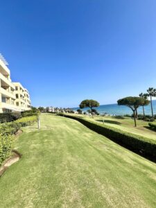 We exclusively offer this beachfront apartment in one of the most beautiful spots on the coast. This complex features an indoor pool, gym, tennis courts, paddle tennis courts, direct access to the beach, and two fabulous pools.