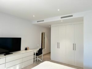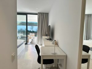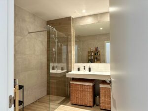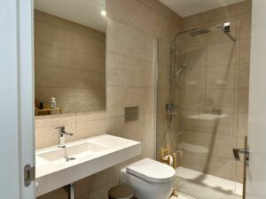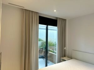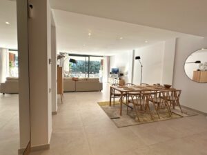 The apartment features a spacious open-plan living area seamlessly combining the living room, modern kitchen, and entrance hall, creating a bright and sophisticated living space. Floor-to-ceiling flow leads to a covered terrace, perfect for al fresco dining, relaxing, or entertaining in all seasons.