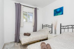 The property comprises two bedrooms and two bathrooms, with the master bedroom benefiting from an en-suite and direct access to the terrace. A second bathroom is located off the hallway, alongside a fully fitted kitchen with a separate utility room. The bright and spacious lounge opens onto a generous sunny southwest-facing terrace, boasting open views over the pool and gardens.