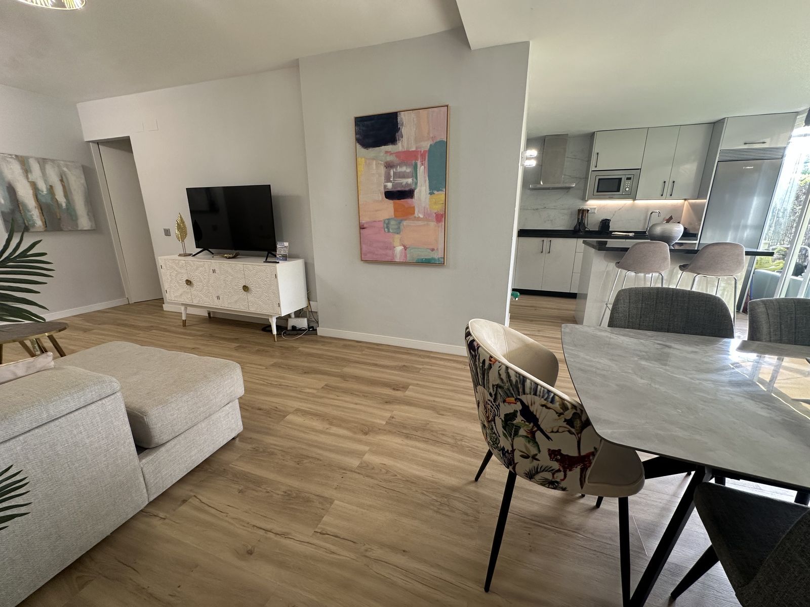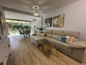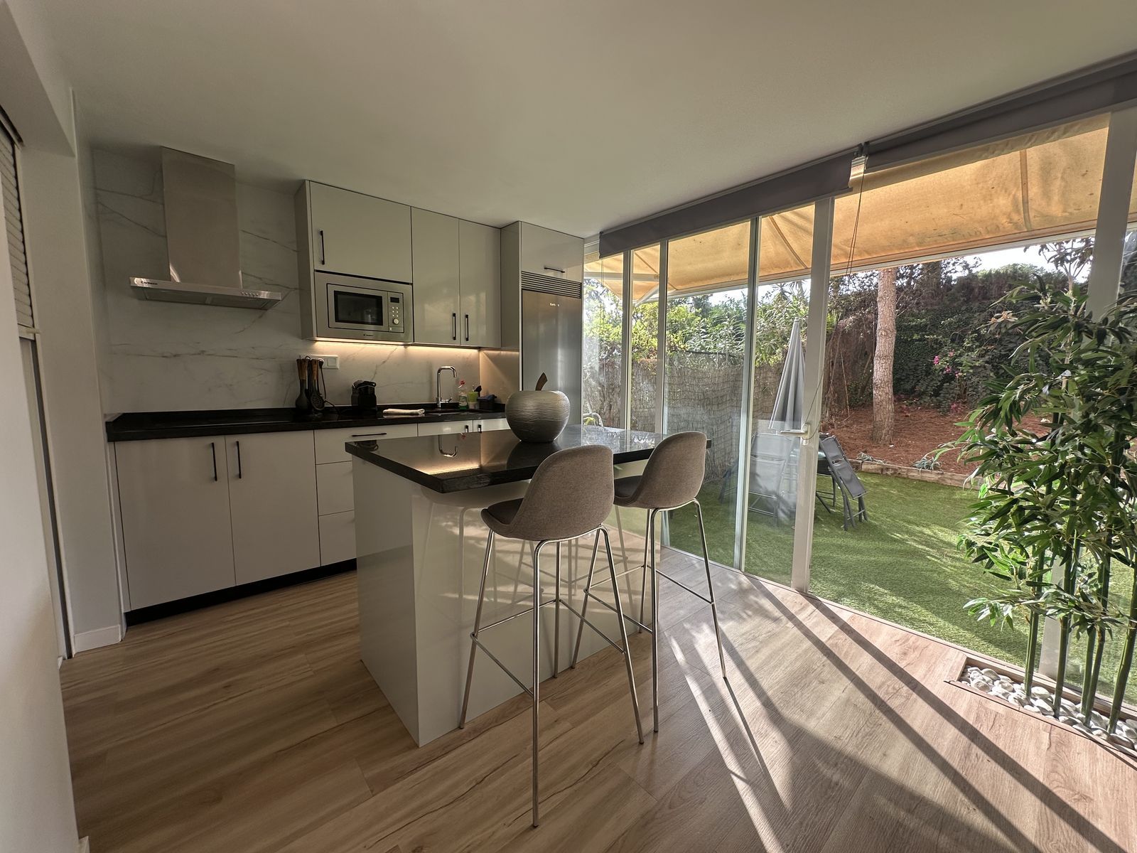 With a total built area of 135 m² (70 m² interior + 65 m² private garden), the apartment was fully renovated in 2023. It offers a bright open-plan living area with a modern kitchen and direct access to the garden, creating an inviting indoor-outdoor lifestyle.