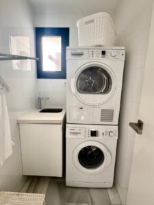 The property features two spacious double bedrooms, a full bathroom, and a separate washroom that can easily be reconverted into a guest toilet. The bright lounge opens onto a generous south-east facing terrace boasting panoramic sea and pool views. A second west-facing balcony offers the perfect spot to enjoy the afternoon sun.