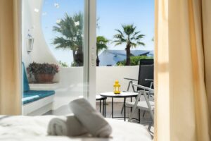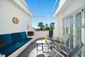 The property offers two double bedrooms, two bathrooms, a bright living and dining area with floor to ceiling windows, and a semi-open modern kitchen. The sunny south-facing terrace with sea views is ideal for outdoor dining or relaxing throughout the year.