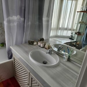 The apartment features a spacious south-facing terrace with sliding doors, allowing you to enjoy the sun almost all day long. From here, you overlook the lush greenery and the sea – a true oasis of calm. The community is small and very quiet, with only 34 homes, ensuring plenty of privacy.