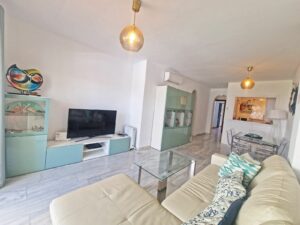The apartment features a spacious and bright layout, with a welcoming living-dining room opening onto a covered terrace overlooking the lush gardens and swimming pool. Its privileged position, with direct access to the pool area, makes it especially ideal for families with children or anyone seeking easy outdoor living. The fully fitted kitchen is semi-open to the living area, combining practicality and comfort. Accommodation includes a generous master bedroom with an en-suite bathroom, plus a second double bedroom and a separate shower room for guests.