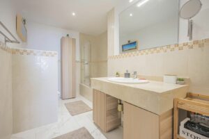 The property includes a private parking space, the largest in the development, with additional room for a motorbike and bicycles. The building also offers an elevator and access to a well-maintained communal swimming pool surrounded by tropical gardens.