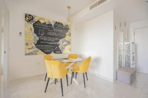The kitchen is fully equipped with state of the art appliances including an oven, microwave, dishwasher, ceramic hob, fridge, and washing machine, all finished to a high standard. The apartment also features air conditioning, high speed internet, and comprises two double bedrooms and two full bathrooms, both with a modern and functional design.