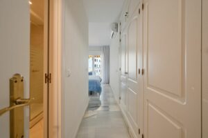 The apartment offers two generous bedrooms, both with built-in wardrobes. The master bedroom features an en-suite bathroom and direct access to the terrace, while the second bedroom is fitted with two single beds that can be arranged together or separately. Both bathrooms have been stylishly renovated and include underfloor heating, adding an extra level of comfort and luxury. A separate fully equipped kitchen and utility room complete the interior layout.