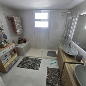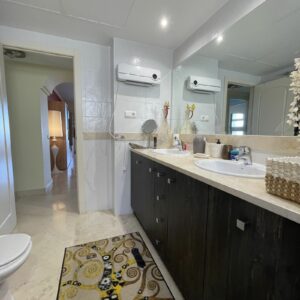 It comprises two bedrooms and two bathrooms. The master bedroom is en suite with direct access to a 50 m² terrace offering sea views.