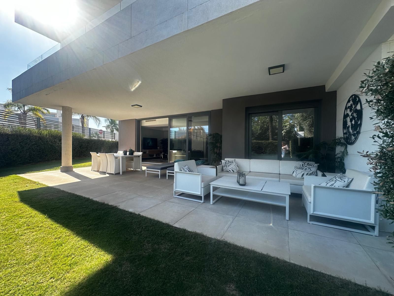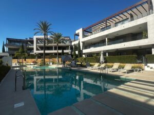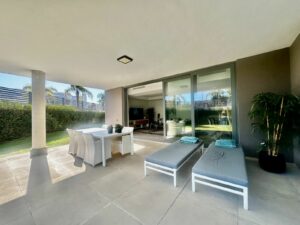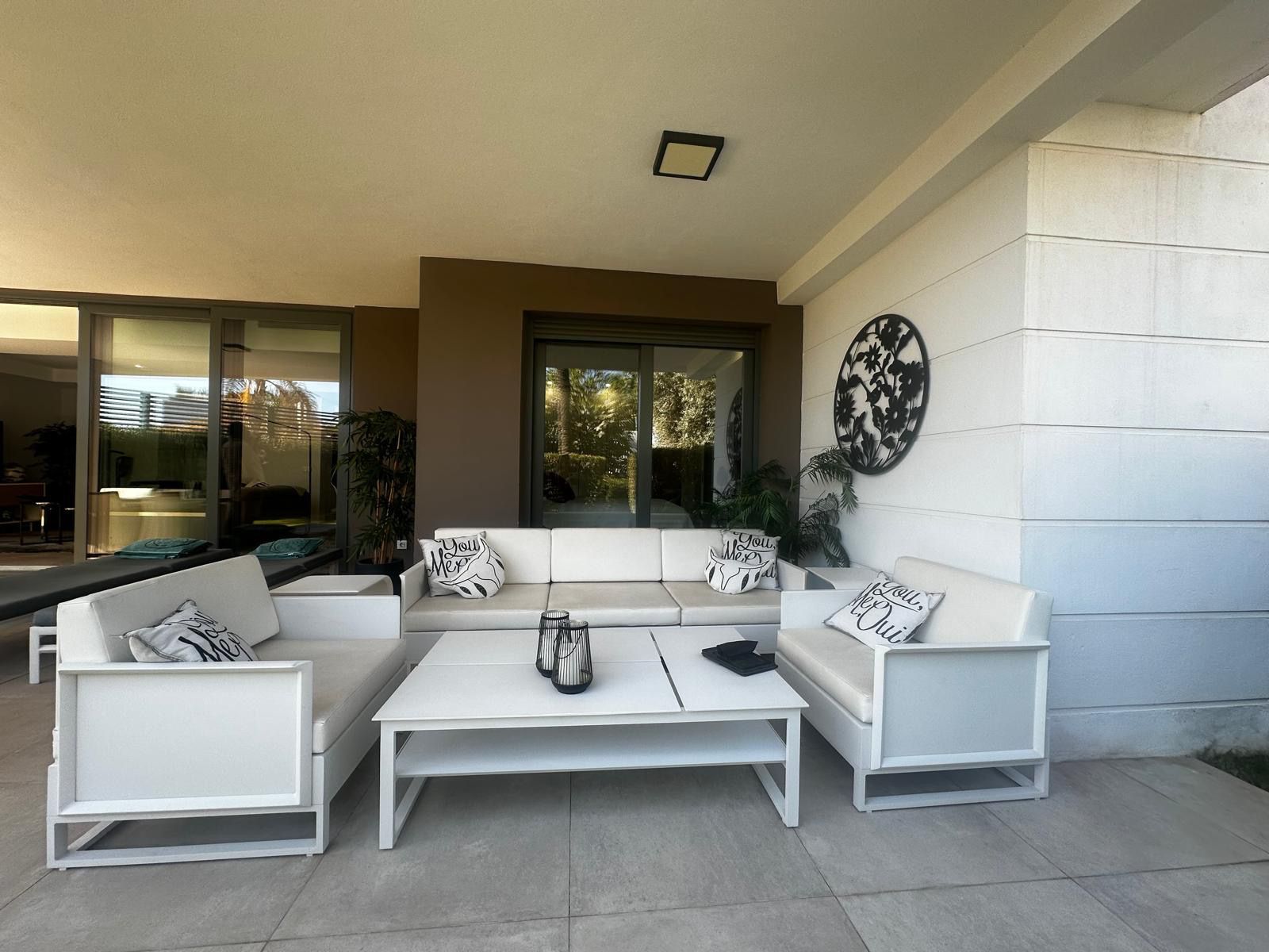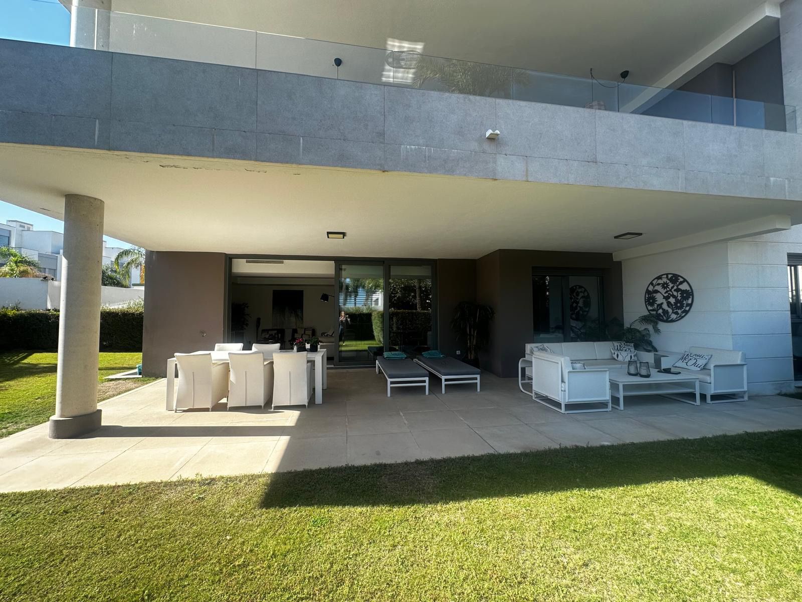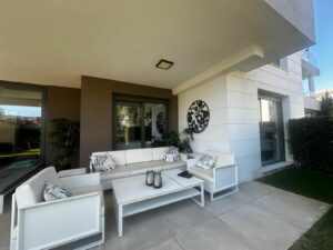 Modern and elegant ground floor apartment with 2 bedrooms and 2 bathrooms, located in the sought-after area of Cancelada (Estepona), just 15 minutes from Marbella, 10 minutes from Puerto Banús, and 5 minutes from the exclusive Anantara Villa Padierna Hotel and Flamingos Golf courses.