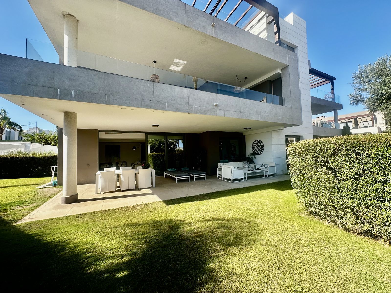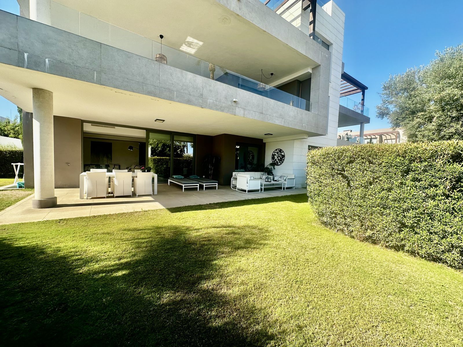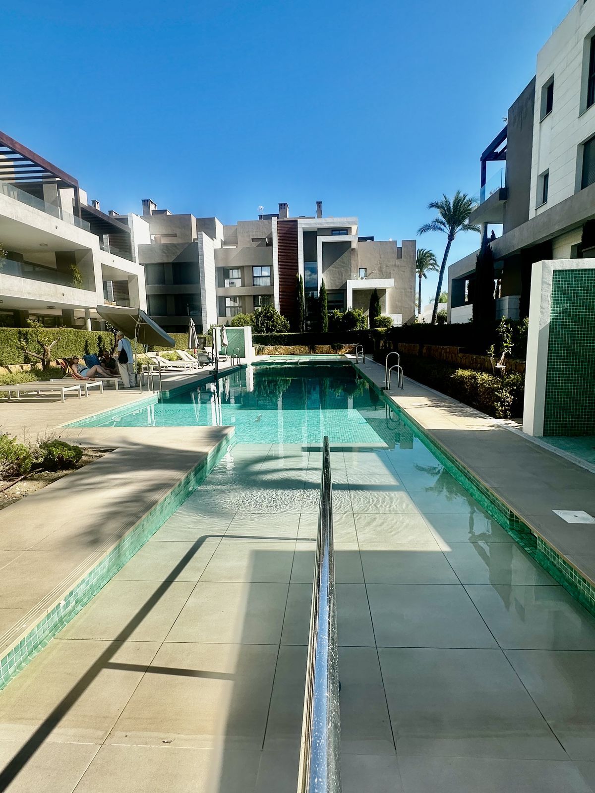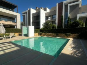 Modern and elegant ground floor apartment with 2 bedrooms and 2 bathrooms, located in the sought-after area of Cancelada (Estepona), just 15 minutes from Marbella, 10 minutes from Puerto Banús, and 5 minutes from the exclusive Anantara Villa Padierna Hotel and Flamingos Golf courses.