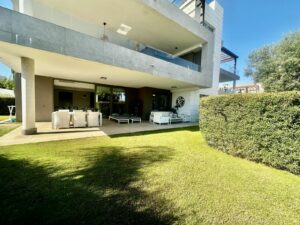 The apartment offers 100 m² built, a 50 m² covered terrace, and a 120 m² private garden for exclusive use. It features a bright open-plan kitchen integrated with the living room and direct access to the spacious terrace, ideal for relaxing or enjoying outdoor gatherings.