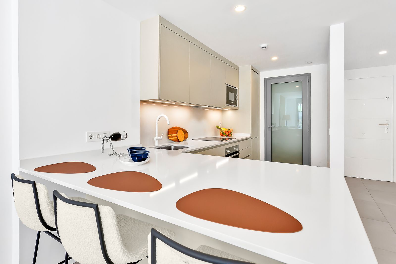 Thanks to its west-facing orientation, the apartment enjoys sunlight from midday all the way through to sunset — perfect for long outdoor dinners or relaxed evenings on the terrace. The fully fitted kitchen comes with quality appliances including a wine fridge, and there is also a separate laundry room with a washing machine.