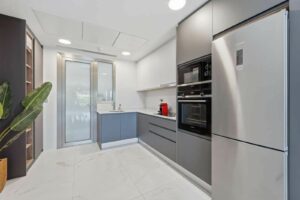 Built in 2020, the Las Mesas urbanisation offers excellent communal facilities, including a large swimming pool, spacious gym, and beautifully maintained gardens. Las Mesas offers excellent connectivity to Estepona’s historic old town and marina, both within walking distance. Nearby are a dog park, sports facilities such as paddle courts and a fitness centre, and shops, all in a peaceful and private setting. Marbella is only 20 minutes away by car, and Málaga Airport can be reached in under an hour via either the A-7 coastal highway or AP-7 highway.