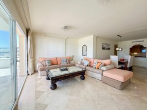 The apartment’s interior is bright and inviting, with an open-plan living and dining area that seamlessly connects to a generous private terrace. Large windows and sliding doors fill the space with natural light and frame beautiful views of the coastline and sea, creating a relaxing atmosphere throughout the home. The kitchen is practical and well laid out, suitable for both daily living and entertaining guests.