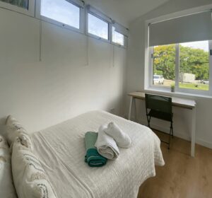 With a total surface of 60 m², it includes 2 bedrooms, 1 bathroom, a fully equipped kitchen, and a bright living room opening onto a terrace overlooking the community gardens.