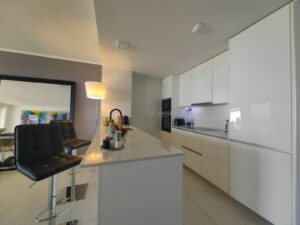 The layout includes two comfortable bedrooms and two full bathrooms, both conveniently located for residents and guests. Generous built-in wardrobes and storage spaces ensure practicality without compromising the apartment’s clean, contemporary design.