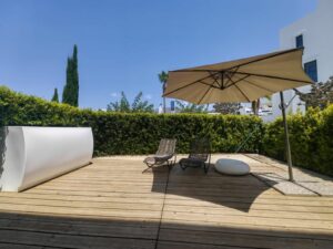 The bright and open-plan living area extends effortlessly onto a large, semi-covered south-facing terrace with partial sea views, creating the perfect setting for enjoying the Costa del Sol’s sunshine all day long. At the rear, a private garden with wooden decking provides a tranquil outdoor retreat, ideal for al fresco dining, barbecues, or simply unwinding.
