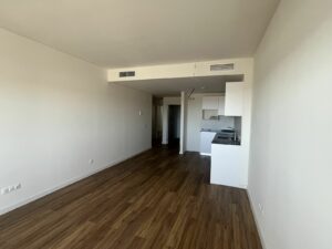 Functional layout – two bedrooms (including a master suite with its own bathroom), a second full bathroom, and a bright open-plan living area connected to the terrace through large glass doors.
