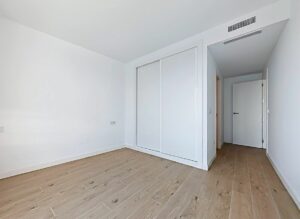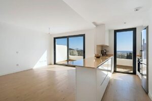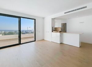 Inside, the property offers 92 m² of interior space, distributed across two bright bedrooms with terrace access, two contemporary bathrooms (one en-suite), and a spacious living area connected to a furnished and fully equipped open-plan kitchen. Built in 2024, the apartment features an efficient aerothermal system supplying both air-conditioning and heating, ensuring comfort throughout the year while reducing energy consumption.