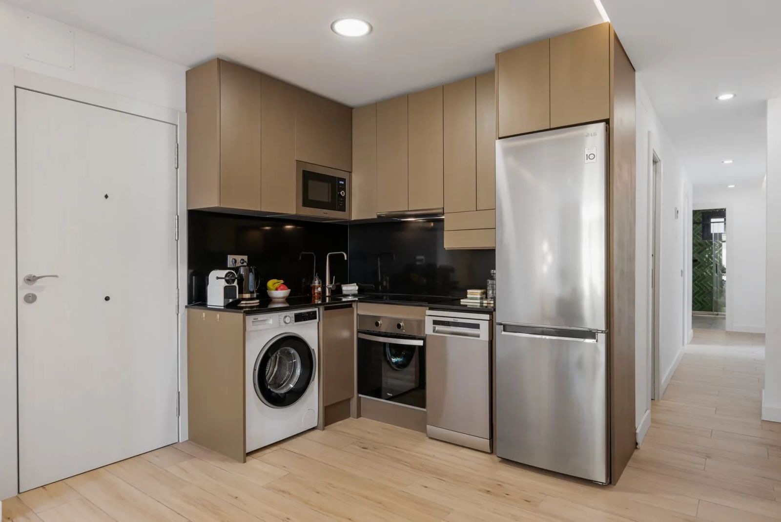 The apartment is situated on the first floor and features a bright living room with an open, modern kitchen equipped with all built-in appliances (dishwasher, oven, microwave, fridge with freezer and washing machine).