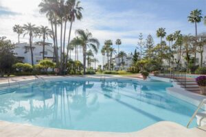 Alcazaba Beach magnificent apartment with large terrace, garden, swimming pool and partial views to the Mediterranean, in exclusive beachfront urbanization, with direct access to the beach, beach bar and restaurant on site, communal parking, 24 hour security, beautiful tropical gardens very well kept, 6 swimming pools (one heated), tennis and paddle courts. It is located on the outskirts of Estepona, with all kinds of services around and only 5 minutes drive from the marina and 10 minutes from Puerto Banus.