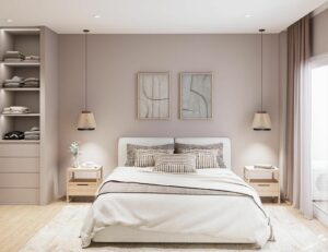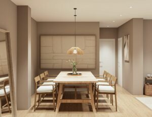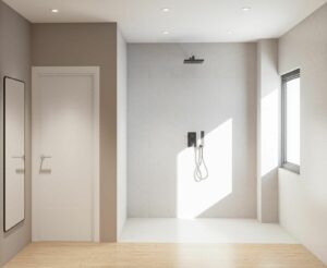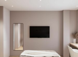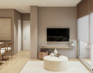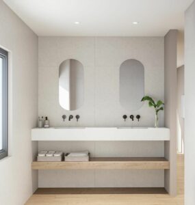 The apartment features two bedrooms, both with built-in wardrobes and modern finishes. The master bedroom has a large private bathroom with a spacious shower, while the second bathroom is also fully equipped and maintains the same contemporary design. Finishes include porcelain flooring in wet areas and double glazing on all windows, ensuring comfort and efficiency.