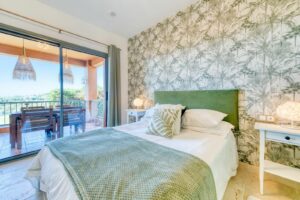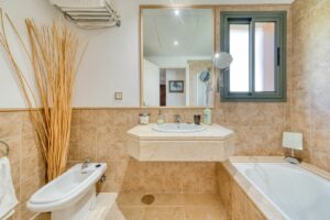 From its privileged position, the apartment enjoys some of the finest views in the entire complex: sweeping vistas across the golf course, Gibraltar, the African coastline, and magical west-facing sunsets. The guest bedroom overlooks the pool and La Concha mountain, creating a serene backdrop. Inside, spacious interiors flow seamlessly to a generous terrace. The open-plan living and dining area is complemented by a fully equipped kitchen with separate utility, two double bedrooms, and two well-appointed bathrooms (one en suite).