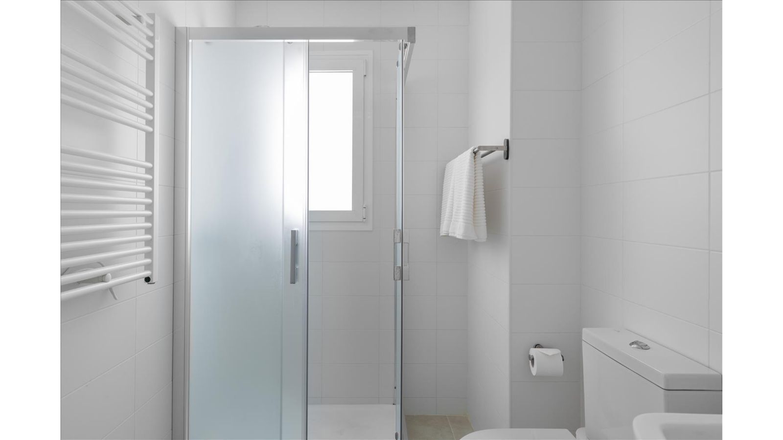 The layout comprises an entrance hall, fully fitted kitchen, bright living–dining area, two bedrooms, two bathrooms, a separate utility/laundry area, and direct access to the terrace. The apartment enjoys a practical and comfortable distribution, ideal for both residential living and rental use.